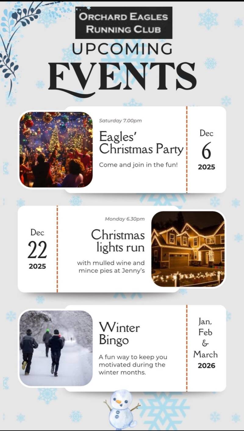 Stay up to date with the latest events and activities at the Orchard Eagles Running Club. Our 'What's On?' page is your go-to resource for upcoming run events and social events. We believe in fostering a supportive and engaging environment for all our members, and we can't wait to see you at our next event!